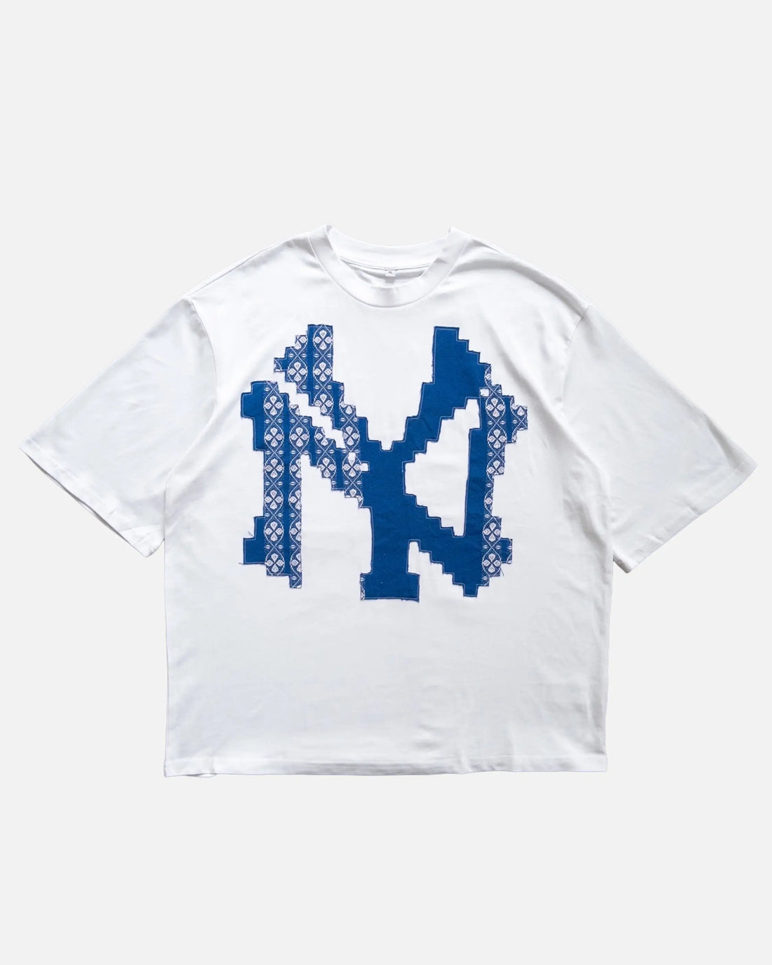 -NY PIXEL APPLIQUÉ-DOUBLE STITCH STITCH-OVERSIZED SLEEVES-BOXY FIT-240 GSM 100% COTTON-RIBBED NECKLINE-1 OF 1, HAND SEWN