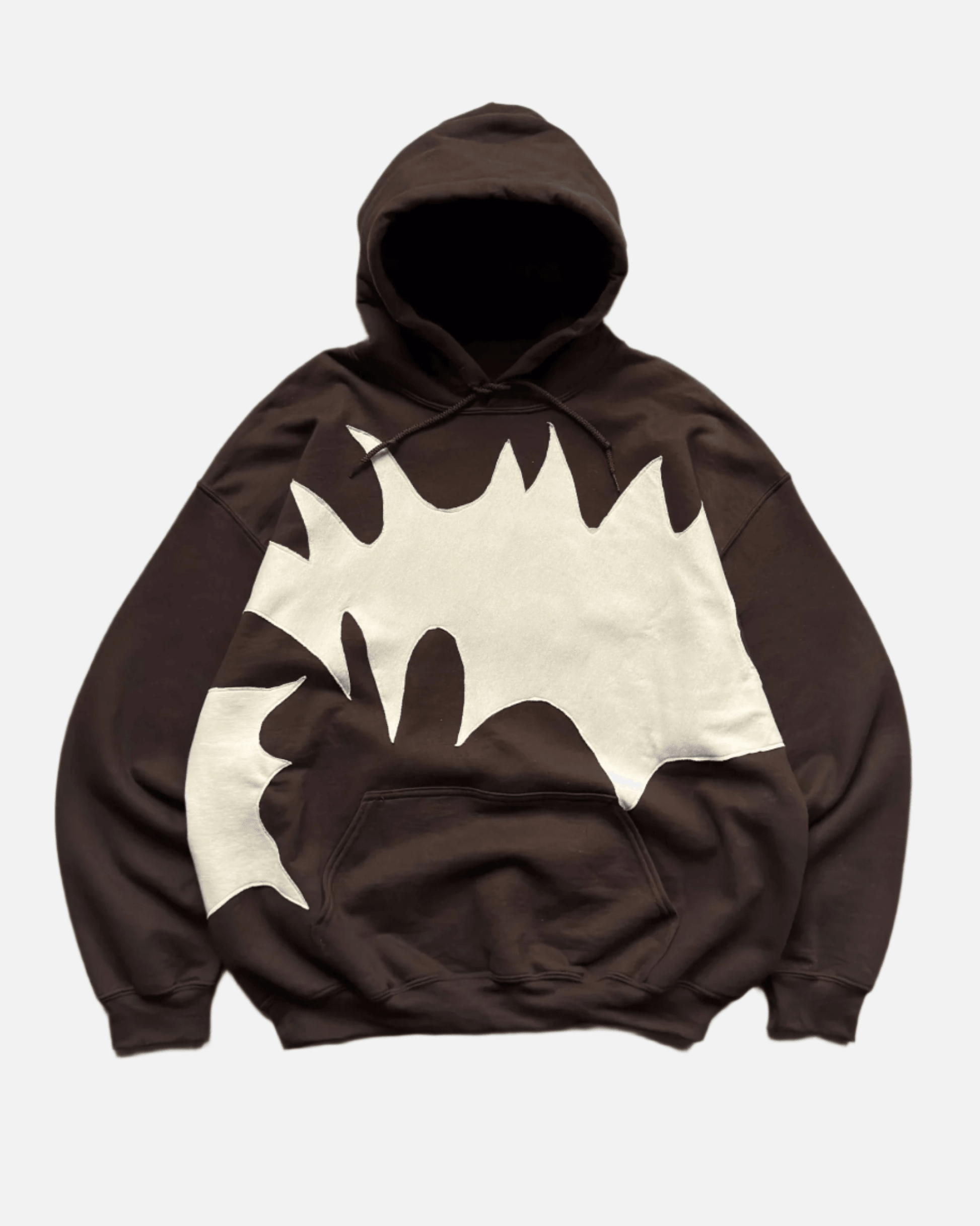 Dark Brown hoodie with beige abstract pattern, kangaroo pocket, drawstring hood and a boxy fit