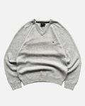 Grey Vintage Pre End Knit V-Neck Sweater in Lambswool with ribbed cuffs, hemline and an embroidered chest logo